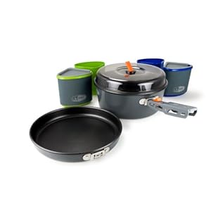 GSI's Gourmet Backpacking Cook System is a unique nesting set which contains everything you need for a two person "Gourmet Backpacking" adventure. In this system you will find two 14oz insulated mugs, two 14 oz bowls, two sip-it tops, a 2L Bugaboo cooking pot w/8" frypan/lid, crushproof strainer lid that works with pot or frypan, and a folding gripper. All this fits into a stuff sack that doubles as a sink or wash basin. The integrated nesting design allows room for your compact stove and fuel also.The entire system weighs only 1lb 10.4oz.